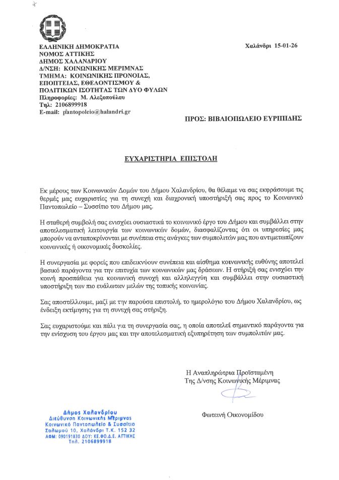 Αρχική / Τα νέα μας / Ευχαριστήρια αποστολή του Δήμου Χαλανδρίου προς τα Βιβλιοπωλεία Ευριπίδης